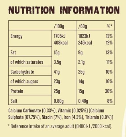 Protein Blend (27%) (Hydrolysed Wheat Protein, Pea Protein, Soya Protein), Humectant (Glycerine), Brown Sugar, Roasted Peanuts (8%) (Peanuts, Vegetable Fat (Palm), Glucose Syrup), White Chocolate Chunks (8%) (Sugar, Cocoa Butter, Whole Milk Powder, Whey Powder (Milk), Lactose (Milk), Milk Fat, Emulsifier (Soya Lecithin), Natural Vanilla Flavouring), Peanut Butter, Caramel Fudge Pieces (5%) (Sugar, Sweetened Condensed Skimmed Milk (Skimmed Milk, Sugar), Glucose Syrup, Fondant (Sugar, Glucose Syrup, Water), Vegetable Oil (Coconut), Dextrose, Stabilisers (Pectin, Sodium Alginate), Natural Flavouring), Olive Oil, Inulin, Fortified Wheat Flour (Wheat Flour, Calcium Carbonate, Calcium Sulphate, Niacin, Iron, Thiamin), Golden Syrup, Flavouring, Raising Agent (Sodium Bicarbonate). May contain nuts. Suitable for vegetarians.